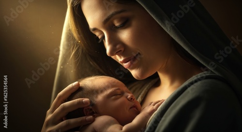 Close-up of Mary’s peaceful face as she lovingly gazes at the infant Jesus in her arms, warm lighting highlighting the tenderness of the moment.