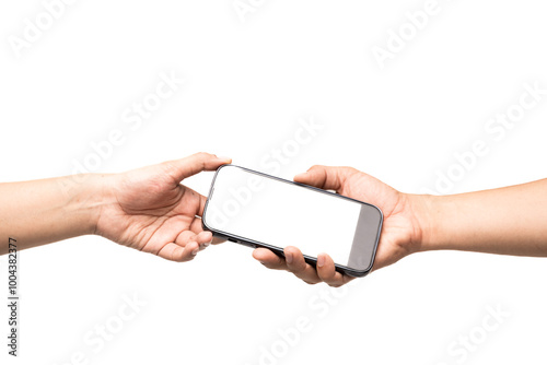 Closeup of men's hands holding cell telephone and white screen with blank copy space for text message .Hand sendng mobile on desk at office.People contact marketing business technology