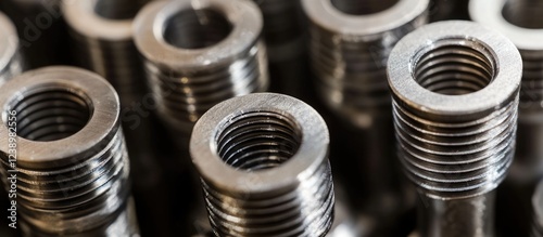 Close-up of metallic screws with detailed threading arranged in a cluster showing texture and reflections industrial background Copy Space