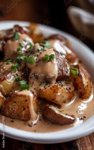 Closeup of Mississippi mud potatoes with a creamy sauce, garnished with green onions, warm ambiance