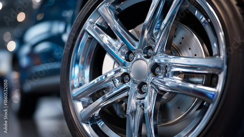 Close-up of modern car wheel, shiny chrome spokes, visible brake disc, automotive design engineering, perforated component, with copy space