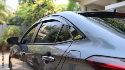 car, vehicle, automobile, exterior, grey, grey, silver, automotive, detailing, styling, design, sedan, window, sunlight, outdoors, day, close, up, tail, light, door, view, tinted, window, accessory, rear, chrome, glossy, modern, polish, smooth, detail, image, isolated, copy, space, daylight, background