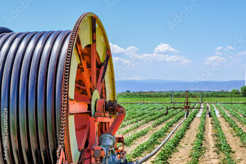 irrigate, irrigation, water, watering, hose, equipment, tool, field, agriculture, agricultural, cotton, plant, crop, outdoors, shower, sprinkler, rural, farming, moisture, wet, grow, growth, automatic, countryside, summer, seasonal, industry, cultivate, cultivation, nature, harvest, nobody, horizon, hot, heat, technology, modern