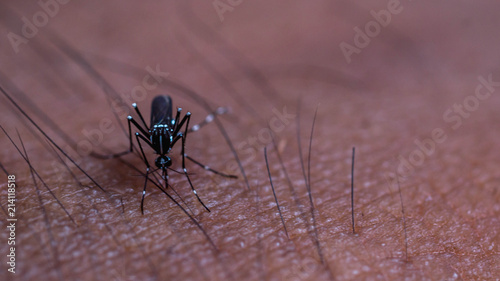 closeup of mosquito biting human skin. Dengue, zika and chikungunya fever mosquito aedes albopictus bite human skin