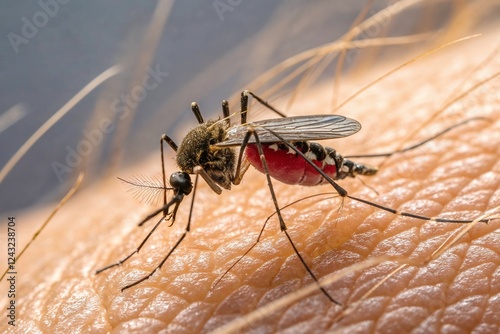 Close-up of mosquito feeding on human skin, detailed macro shot, insect nature
