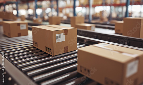 Closeup of multiple cardboard box packages seamlessly moving along a conveyor belt in a warehouse fulfillment center, a snapshot of e-commerce, delivery, automation, and products