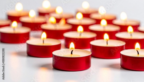 Close-up of multiple lit red tea light candles on a white surface, creating warm light
