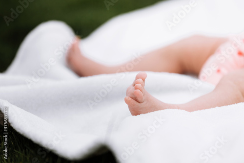Closeup of newborn baby girl feet on white blanket outdoor. maternity and childhood concept