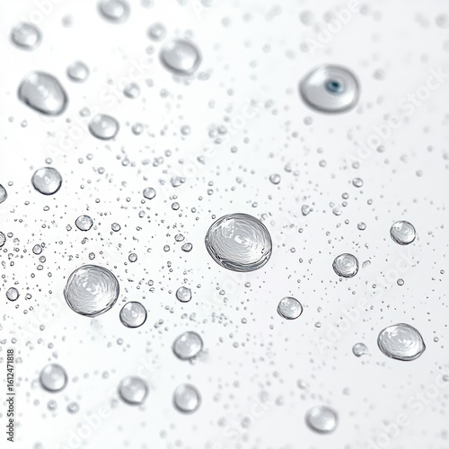 Close-up of numerous clear water droplets of varying sizes on a smooth transparent surface creating a fresh and pure atmosphere
