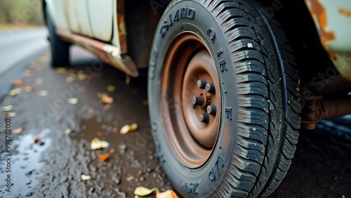 Close-up of old car tire on wet road with leaves