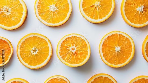 Close-up of orange slices laid out on a clean white table, forming a bright and refreshing background