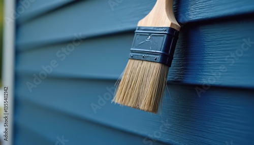 Close-up of paintbrush resting against freshly painted blue wall. Home renovation, construction or repair concept. Paint brush, color blue, wood surface with horizontal texture. Home improvement.