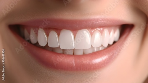 Close-up of perfect smile, pearly white teeth, healthy pink gums, soft full lips, flawless dental aesthetics, macro photography, dental perfection, cosmetic dentistry, natural lighting.