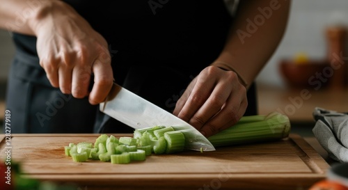 Close-up of person chopping celery on wooden cutting board, wearing dark apron, preparing food