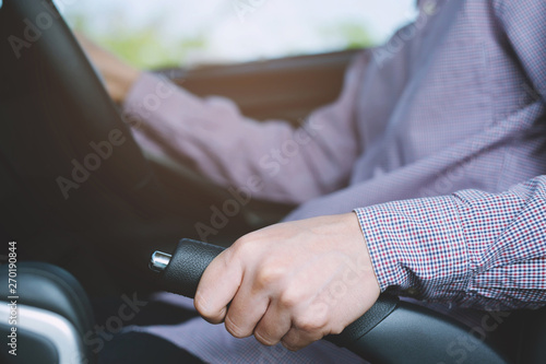 Closeup of person hand pulling handbrake lever in car For safety while parking.