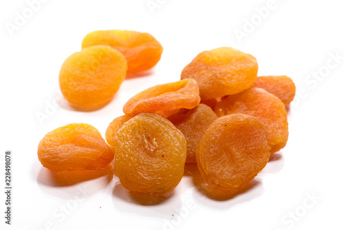 Close-up of pile dried, raw apricots on white background
