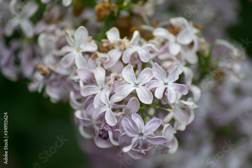 Close-up of pink lilac flower in bloom, blossoms in spring season, macro nature outdoors, seasonal, green background, Syringa vulgaris