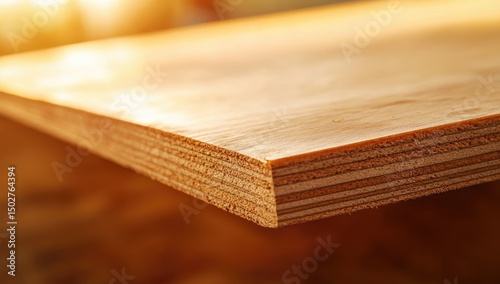 Close-up of plywood panel, showing wood grain layers. Natural light highlights the surface