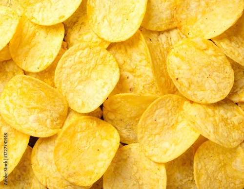 chips, potato, food, yellow, crispy, texture, snack, round, stacked, pile, closeup, background, foodstuff, savoury, gold, pattern, many, layer, surface, detail, light, xanthous, image, close, delicious, stack, view