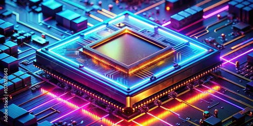 Close-Up of Processor Technology Illuminated by Neon Lights for Generative AI Applications, Highlighting Modern Computing and Innovation in the Digital Age