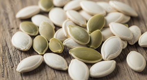Close-up of pumpkin seeds on a wooden surface, showcasing their natural texture and colors.