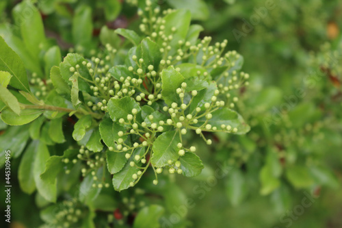 Close-up of Pyracantha bush with many small white blossoms on branches. Firethorn in bloom on summer