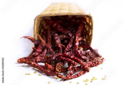 Closeup of red dry chili peppers in basket on white background.