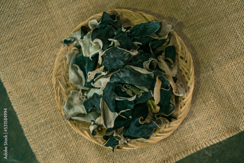 Close-up of red ear mushroom cultivation, which is organic farming, is becoming increasingly popular with farmers, photos of oyster mushrooms have been harvested and placed on plates before packaging