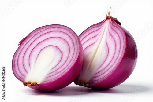 Close-up of red onion halves, showing layers, pure white backdrop, cooking, produce, agriculture