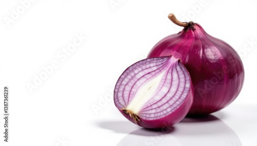 Close-up of red onion, showing layers and texture, white backdrop , sliced, natural