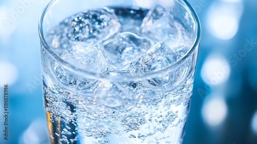 Closeup of refreshing sparkling water with ice and bubbles : Generative AI