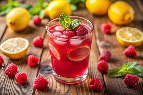 Close-up of refreshing summer drink with raspberries lemons and mint