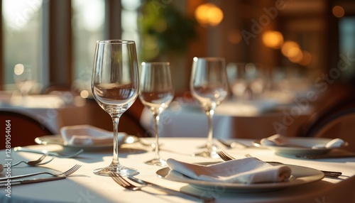 Close-up of restaurant table setting with tableware, empty wine glasses. Concept of fine dining, hospitality, catering. Luxury elegant romantic service for events. Evening reservation at eatery.