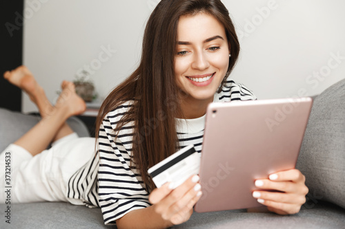 Close-up of resting attractive girl lying couch with digital tablet and credit card, woman relaxing and shopping from comfortable sofa, order online, checking bank account or making internet purchase