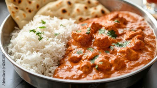 Close-up of rice and Indian butter chicken with garlic naan in a stainless steel bowl, emphasizing rich and creamy qualities. Ideal for Indian cuisine and comfort food.