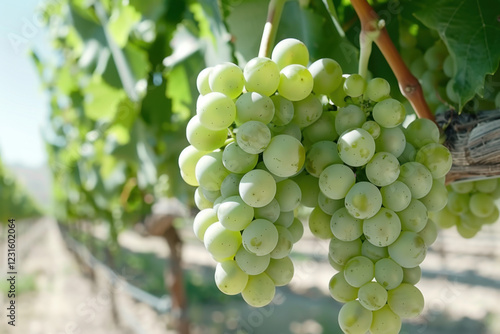 Close-up of ripe green grape clusters hanging on the vine in a sunny vineyard, surrounded by lush leaves and natural light.