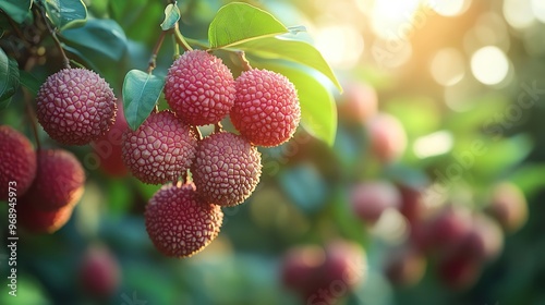 Closeup of ripe lychee fruit hanging from a tree, bright daylight, lush greenery in the background
