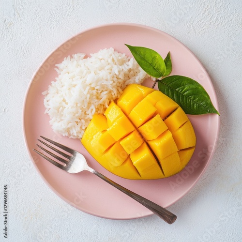 Close-up of ripe mango with sticky rice on a pink plate and fork showcasing the vibrant yellow texture against a white background
