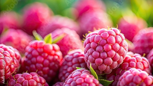 Close-up of Ripe Pink Raspberry in Tilt-Shift Photography, Macro Shot of Fresh Sweet Raspberries with Nature Background, Selective Focus on Juicy Berries, Vibrant Colors, and Textures