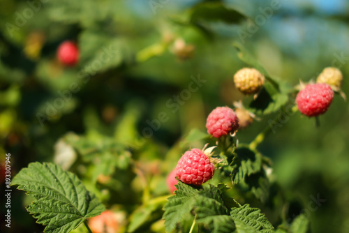 Close-up of ripe raspberries ready to be picked. Growing organic berries in an orchard.