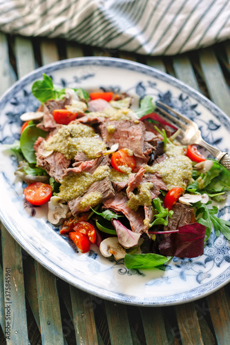 mushroom, meat, leftover, food, dine, chard, beef, arugula, copy space, vertical, tomatoes, table, summer, spinach, seasonal, salad, rocket, roast, radicchio, platter, pesto, overhead