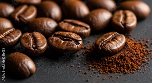 Close-up of Roasted Coffee Beans with Ground Coffee on Dark Background
