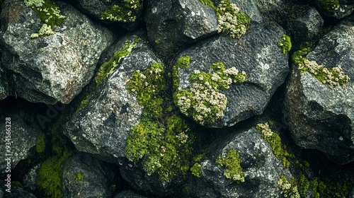 Close-up of rocks covered in moss and algae, highlighting the intricate details and textures of nature