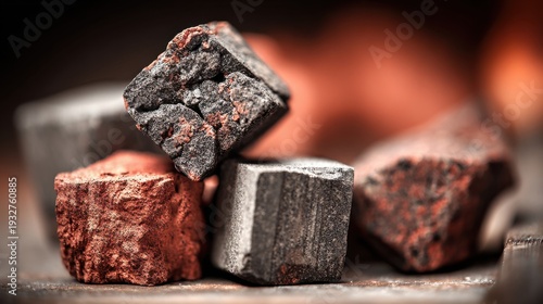Closeup of rough, natural charcoal pieces and glowing embers, showcasing the raw energy and texture of burning fuel for various applications.