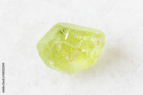 closeup of sample of natural mineral from geological collection - rough Olivine (Peridot, Chrysolite) crystal on white marble background from Kaghan Valley, Naran, Sapat Gali, Pakistan
