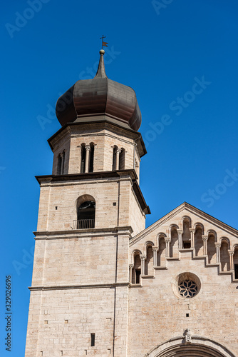 trent, cathedral, church, facades, rose window, bell tower, historical building, religion, landmark, romanesque, mediaeval, basilica, italy, italian, tour tourism, stone, marble, christianity, catholicism, art, architecture, old, ancient, church, blue, sky, clear, city, history, antique, downtown, tower, column, dome, exterior, europa, town, arch, travel destination, european, past, building, colonnade, cross, photo