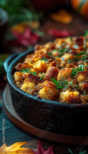 Close-up of savory baked casserole with crispy toppings, garnished with fresh herbs, served in a rustic dish, perfect for comfort food.
