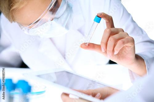 Closeup of scientific research team with clear solution in laboratory. Blonde female chemist holds test tube of glass while her colleague checks results with tablet pc. Blood test, medicine or