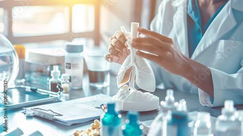 Close-up of scientist examining lung model with asthma symptoms, surrounded by medical research tools and charts in well-lit laboratory. Medical research, asthma study, and scientific investigation co