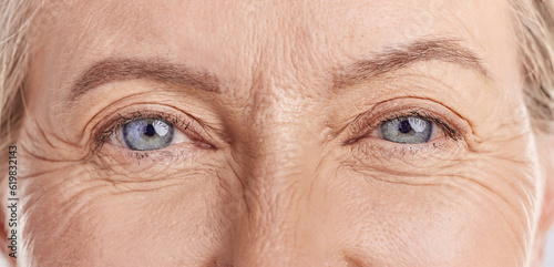 Closeup of senior woman, eyes and wrinkles with vision, skin with face and natural beauty. Anti aging, dermatology and female model with eye care, wellness and cosmetics, skincare and contact lens